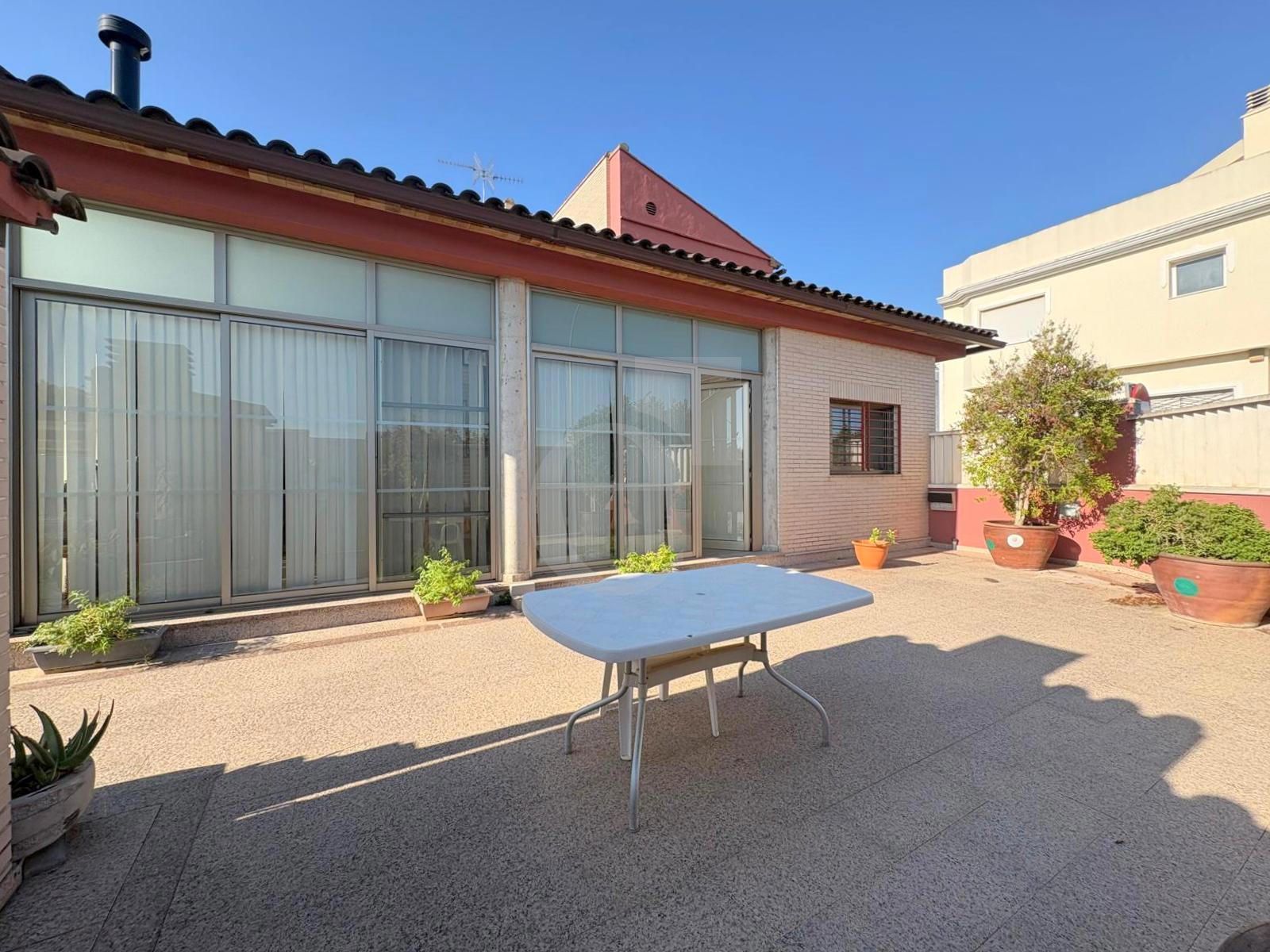 Frente al porche acristalado se encuentra un amplio espacio exterior con paellero, perfecto para reuniones familiares o con amigos.